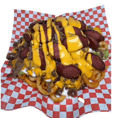 Carne Asada, Polish Sausage, guacamole, Sour cream, Nacho cheese & curly Fries