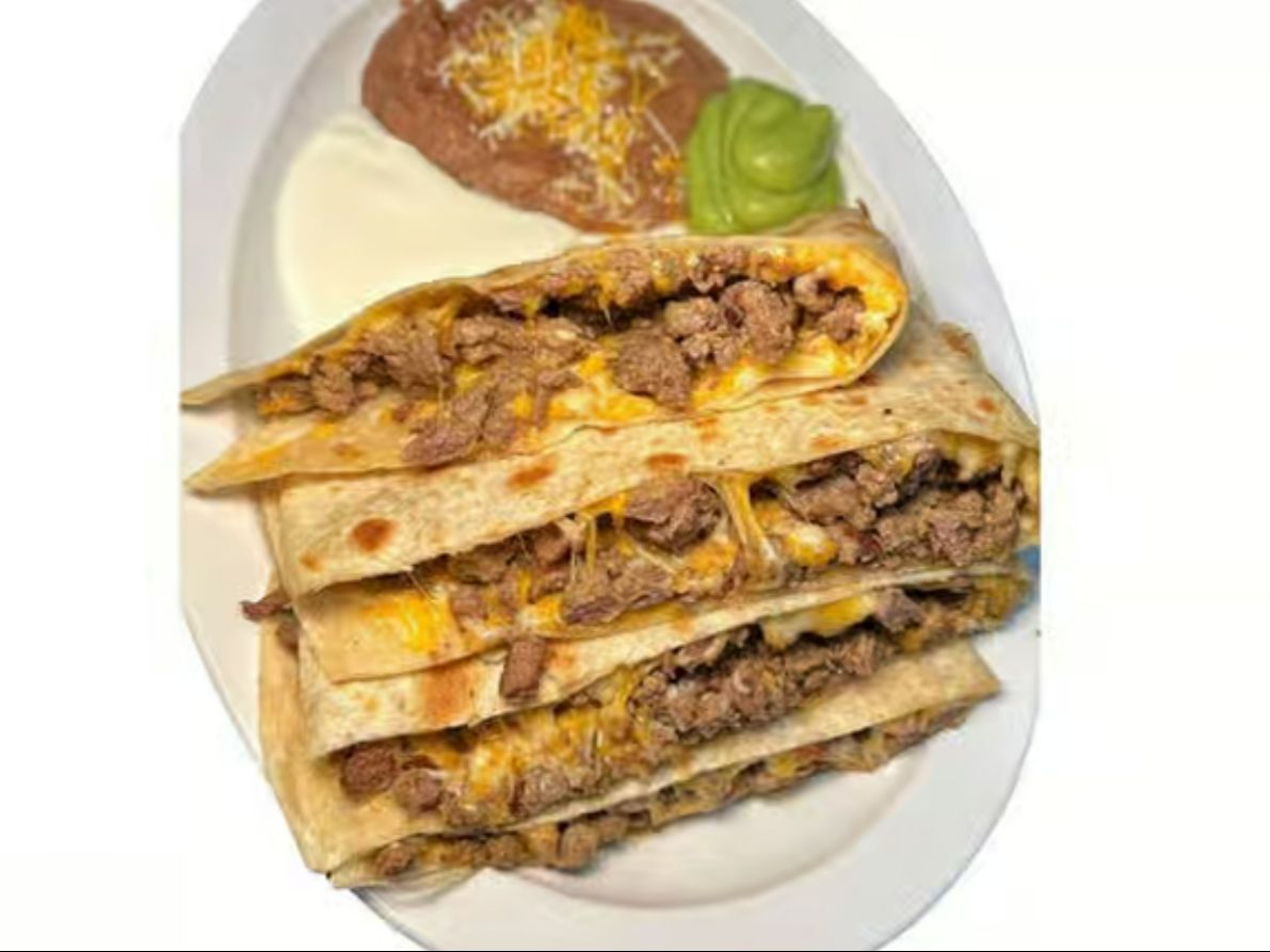 Carne Asada quesadilla with guacamole, sour cream & beans on the side