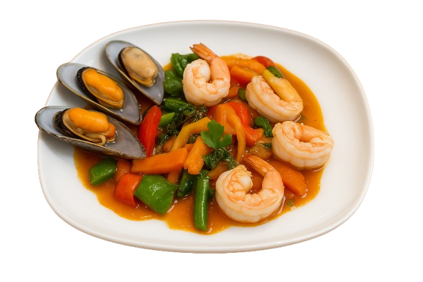 Sauteed fresh Thai basil, red & green bell peppers, garlic, green beans, carrot and white onions in a Thai basil sauce.