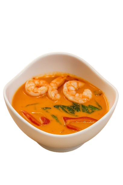 Red curry with coconut milk, contains shrimp paste, red & green bell peppers, bamboo shoots, zucchini, with Thai basil, and kaffir lime leaves.