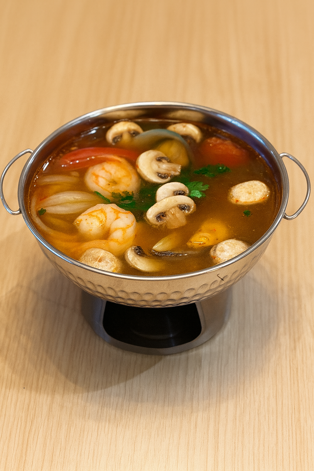 Hot & Sour soup with galangal, lemongrass, kaffir lime leaves, mushrooms, cut tomatoes, white onions, contained fish sauce and lime juice topped with fresh cilantro.