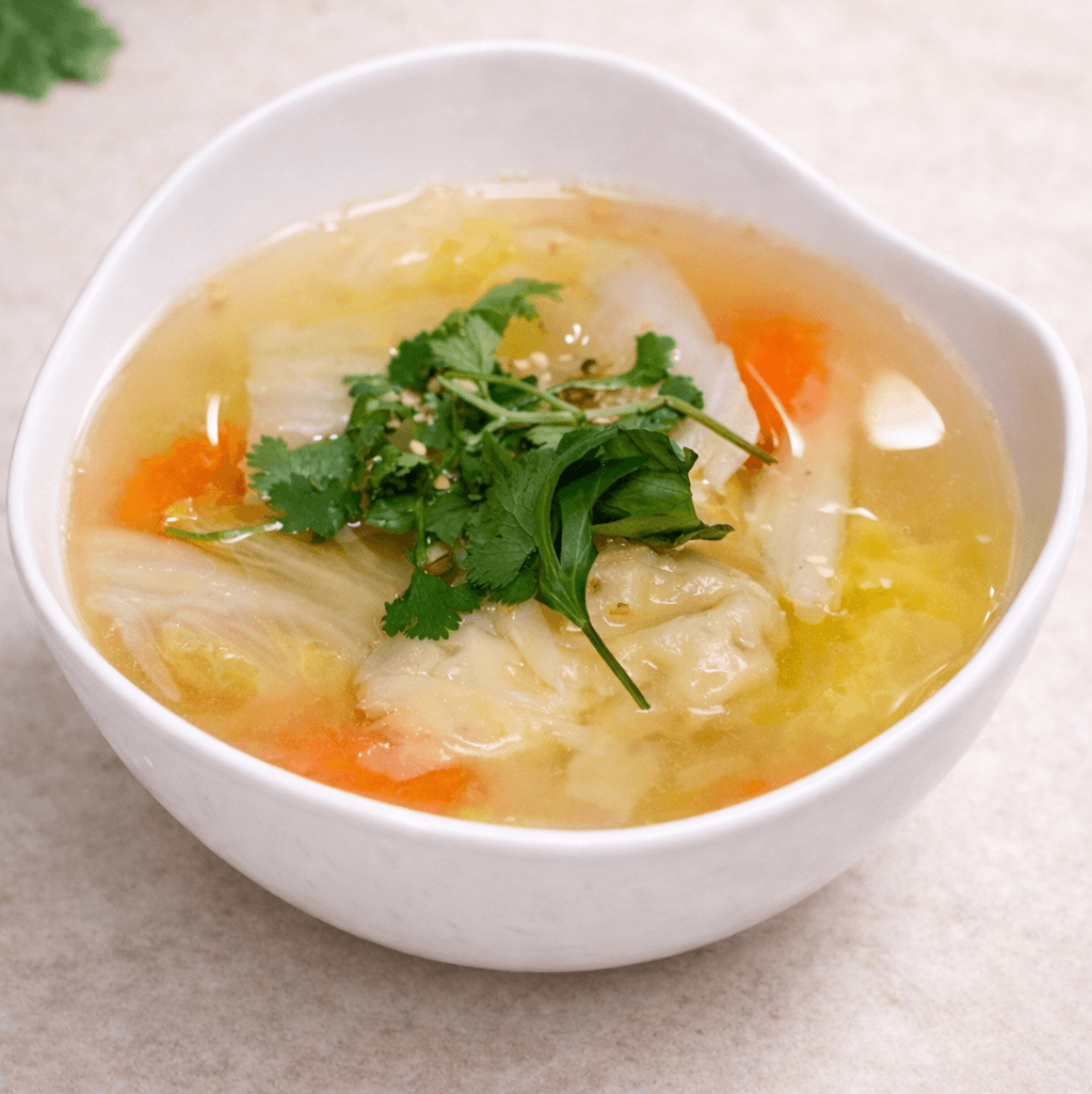 Wonton stuffed with ground shrimp & pork in a chicken broth, carrots and napa cabbage garnished with fresh cilantro and fried garlic.
