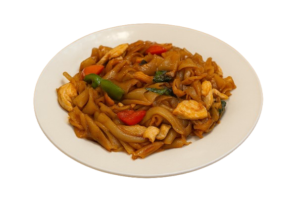 Stir-fried fresh wide rice noodles served with chopped garlic, egg, green & red bell peppers, white onions, and basil.