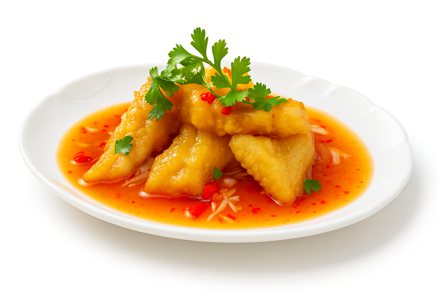 Lightly crispy fish fillet on a bed of sliced cabbage garnished with tamarind sauce, sauteed green & red bell peppers and white onions.