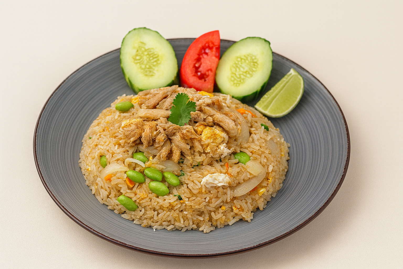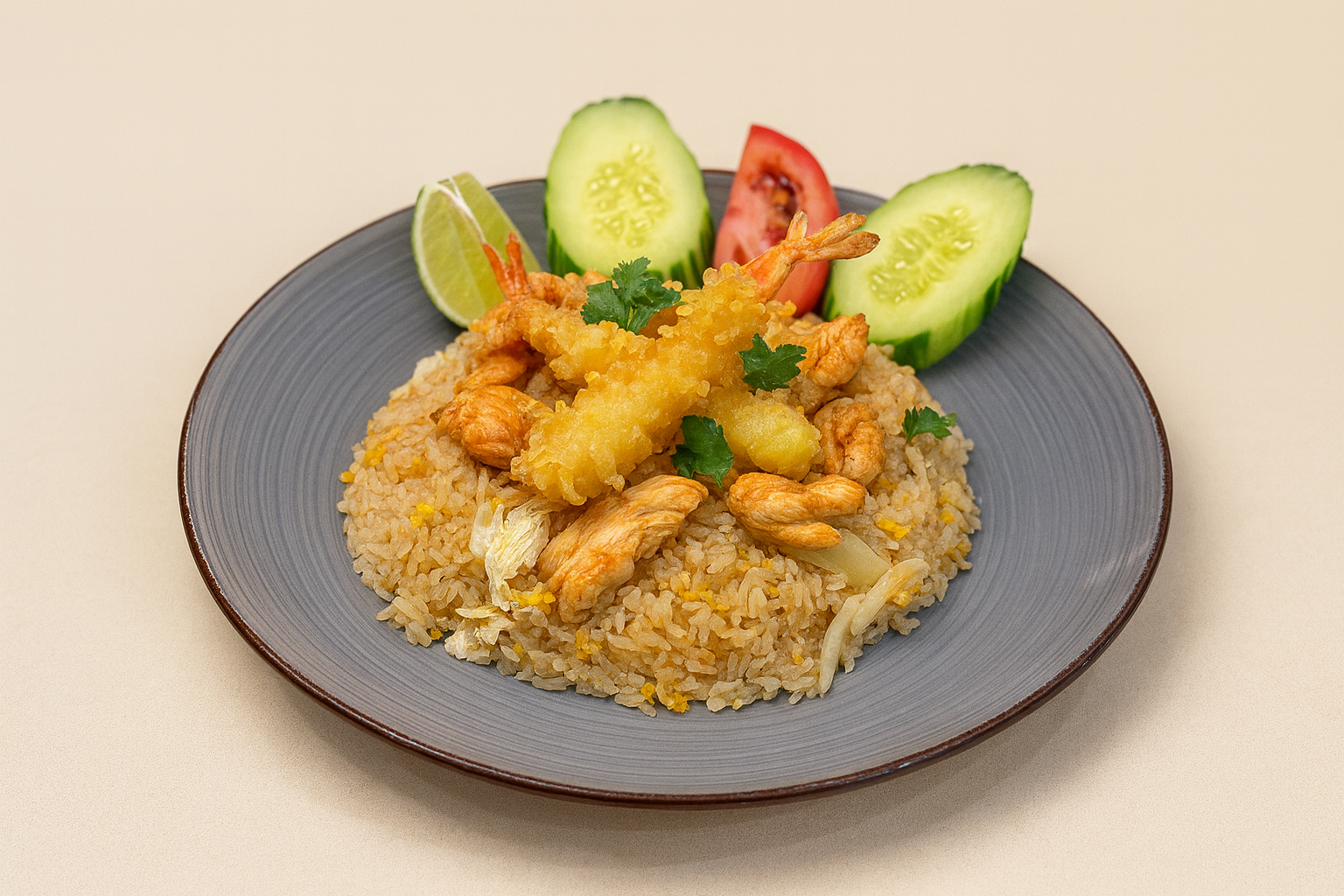Thai Jasmine Rice stir-fried with REAL CRAB meat, egg, peas & carrots, white onions.