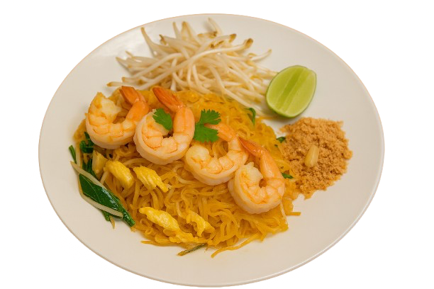 Stir-fried fresh thin rice noodles served with egg, Chinese chives, and bean sprouts, contains fish sauce, garnished with chopped roasted peanuts.