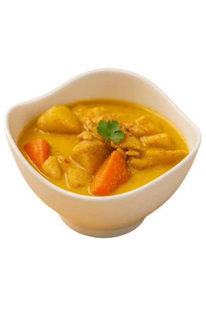 Yellow curry with coconut milk, potatoes, carrots, and white onions.