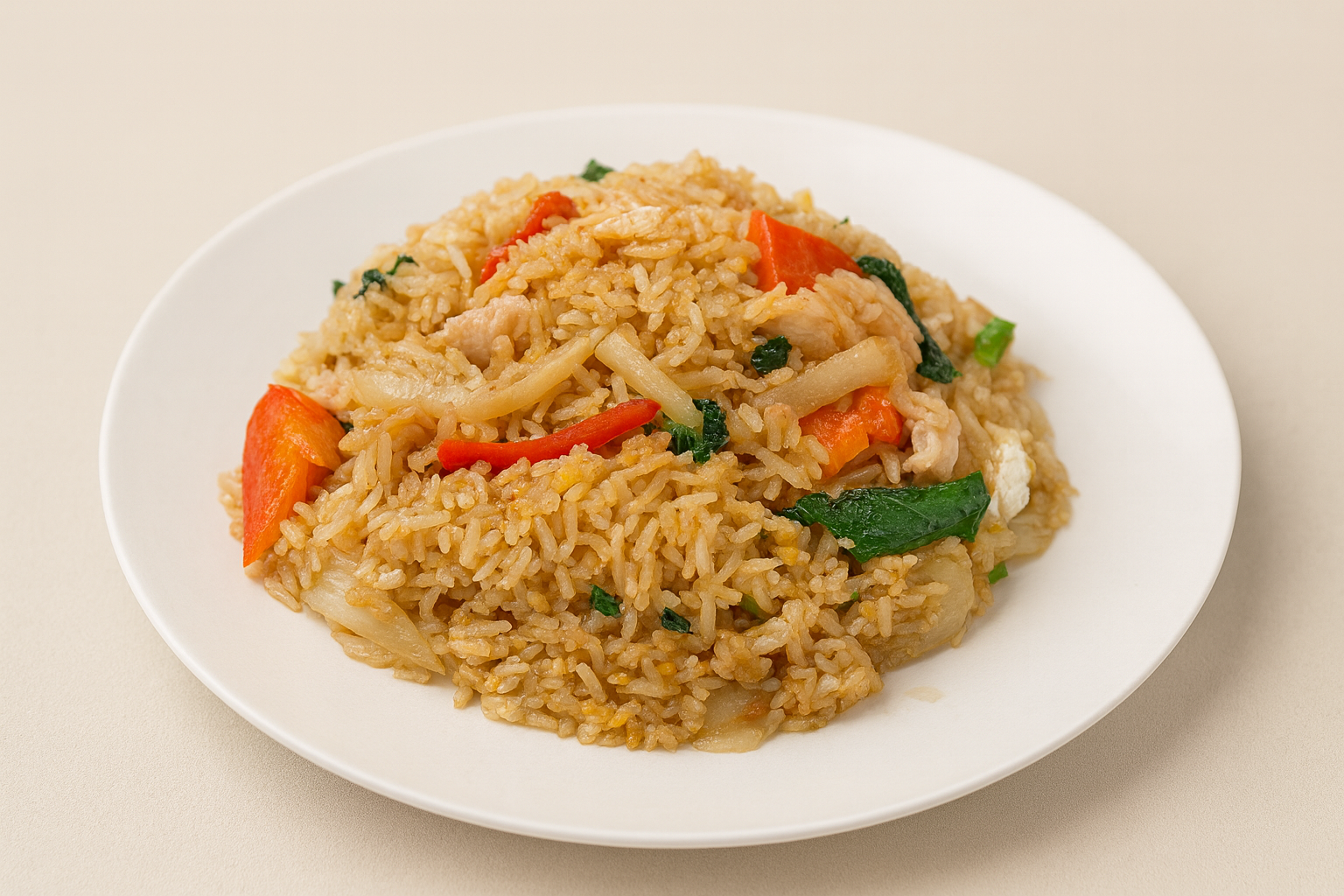 Thai Jasmine Rice stir-fried with chopped garlic, egg, red & green bell peppers, white onions, and fresh Thai basil.