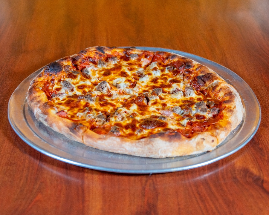 Thin crust with ham, mozzarella, provolone, feta, olive oil & garlic