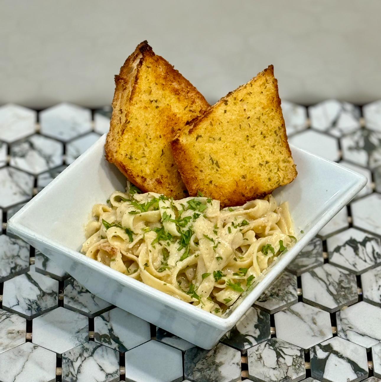 Grilled chicken, sauteed red onions, bell peppers, tossed in a creamy Chipotle-Alfredo Sauce, topped with cilantro and queso fresco. Served with garlic bread.
