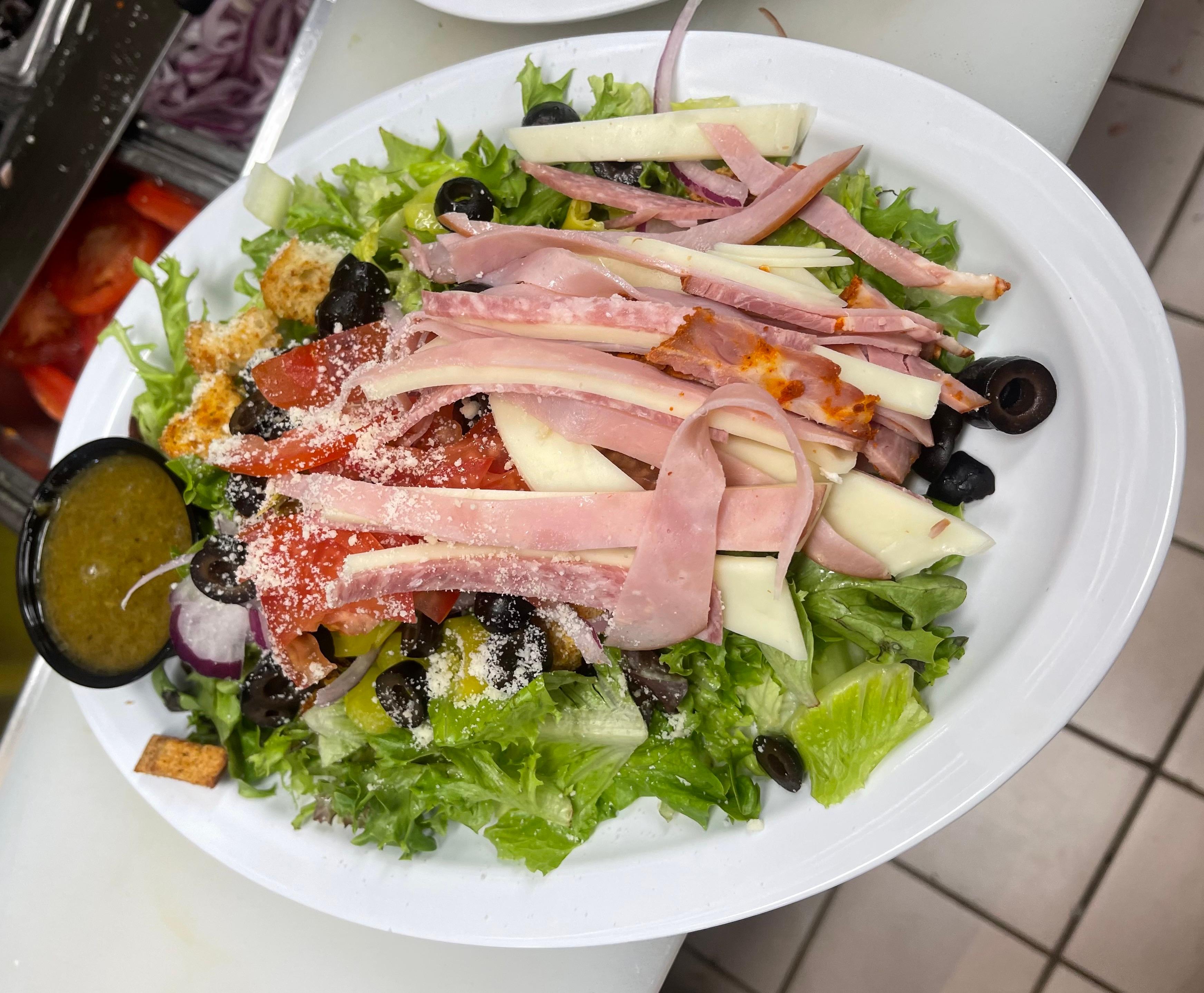 Mixed greens, capicola-ham, salami, provolone cheese, sliced tomatoes, olives, pepperoncini, red onions, croutons and parmesan cheese