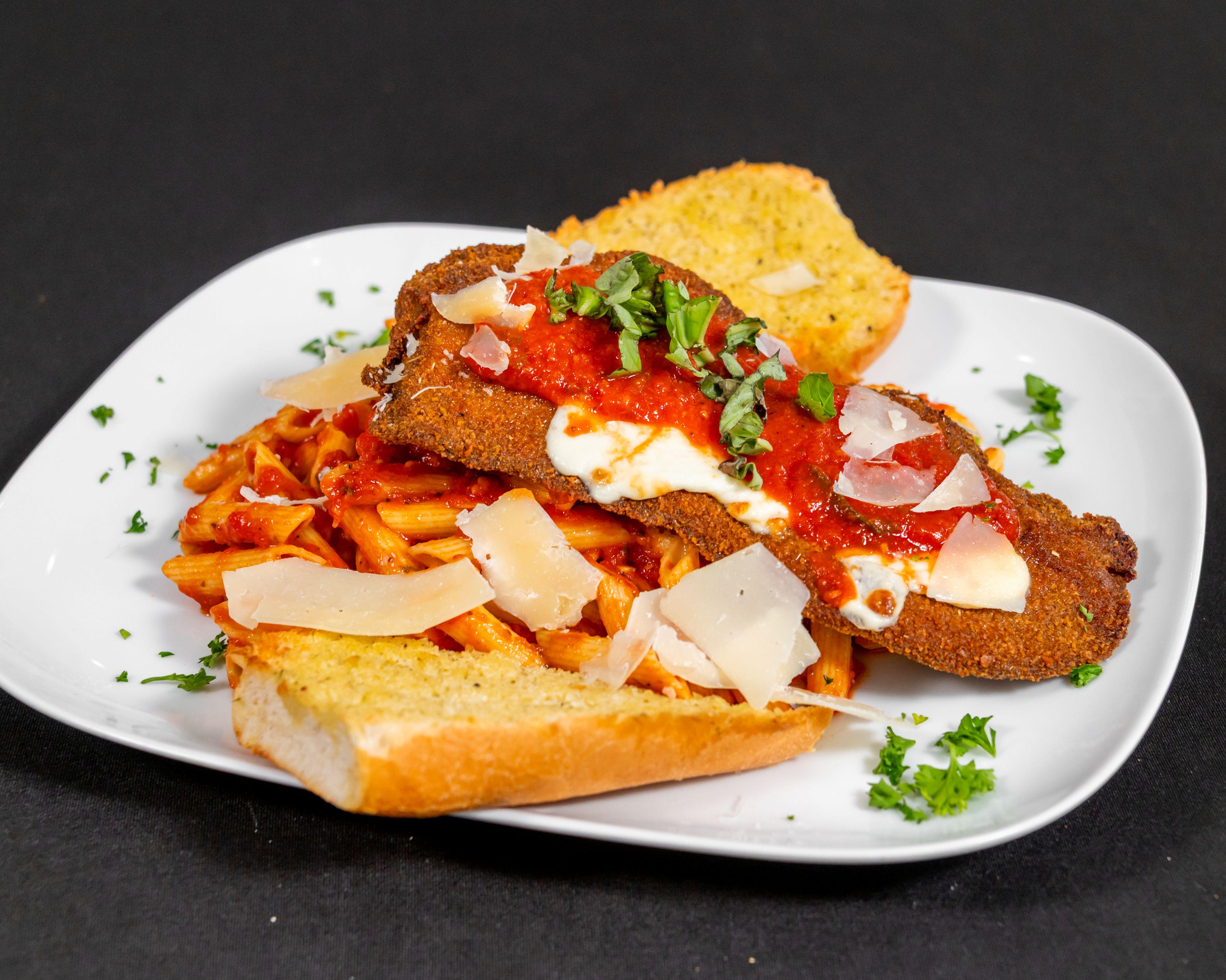 A lightly breaded chicken breast fried then topped and baked with marinara sauce and mozzarella cheese. Served with penne pasta and marinara sauce. Served with garlic Bread. Substitute Eggplant Parmesan
