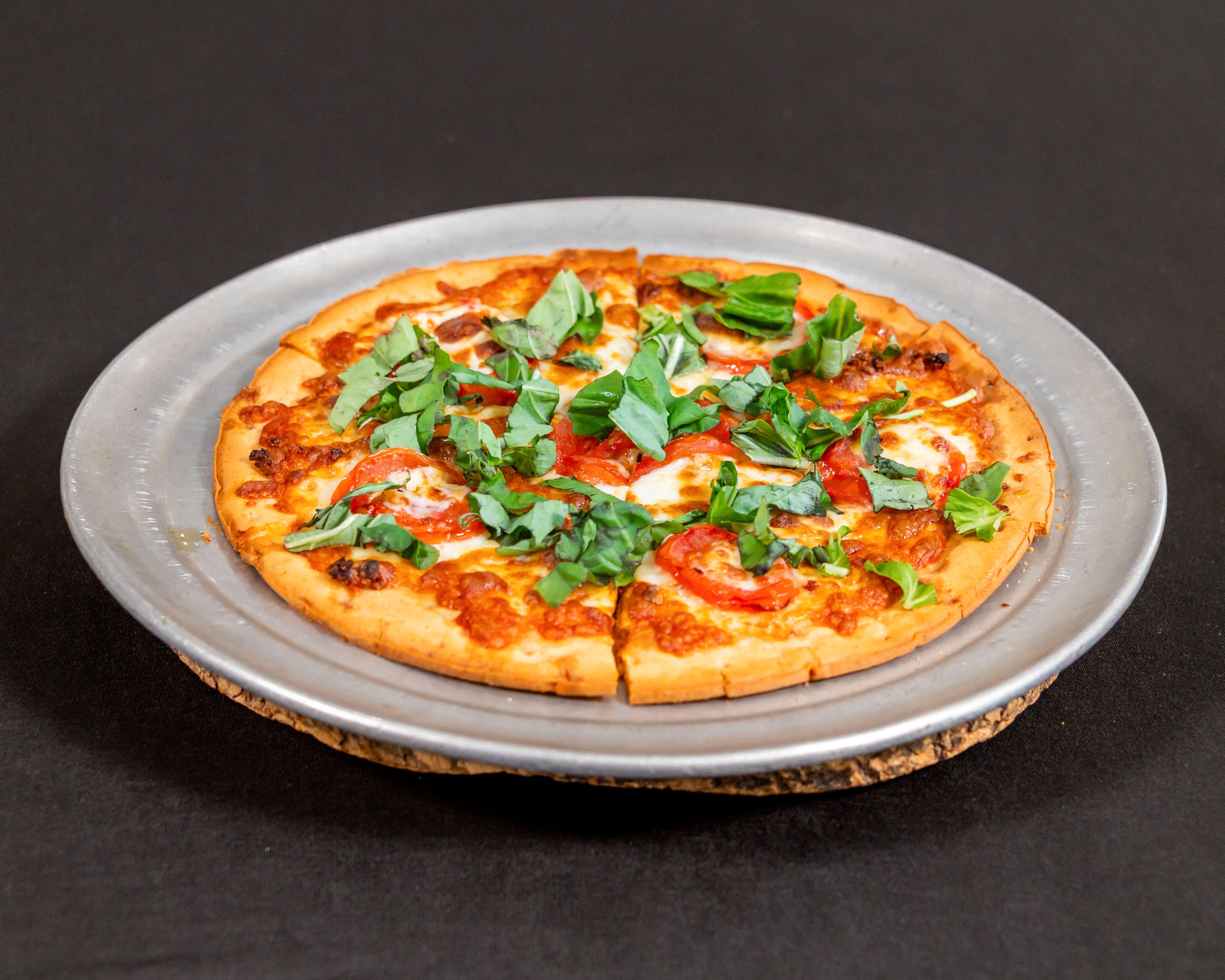 Build your own pizza 10". Start with basic cheese pizza with tomato sauce, then pick your toppings and modify the sauce or cheese options