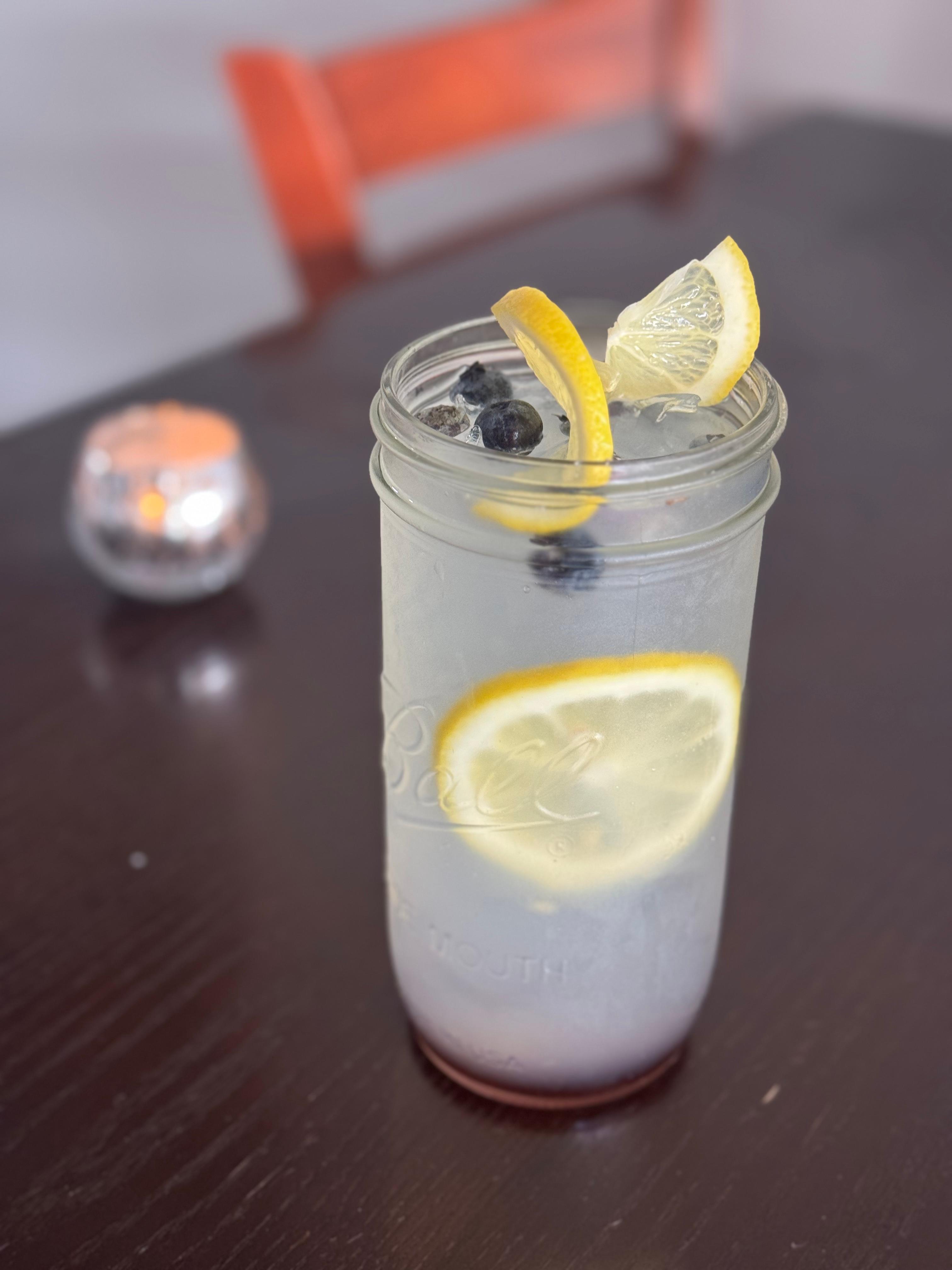 Fresh squeezed lemon juice, brown sugar and blueberry syrup. Served on ice garnished with fresh fruit.