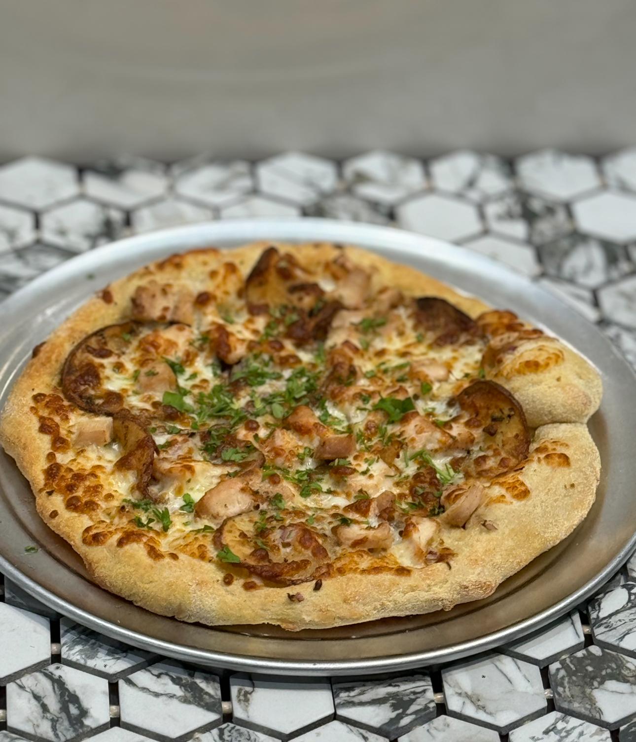 Oven roasted rosemary potato, grilled chicken, oregano, roasted garlic, scallions & mozzarella cheese on butter-garlic sauce topped with chopped parsley