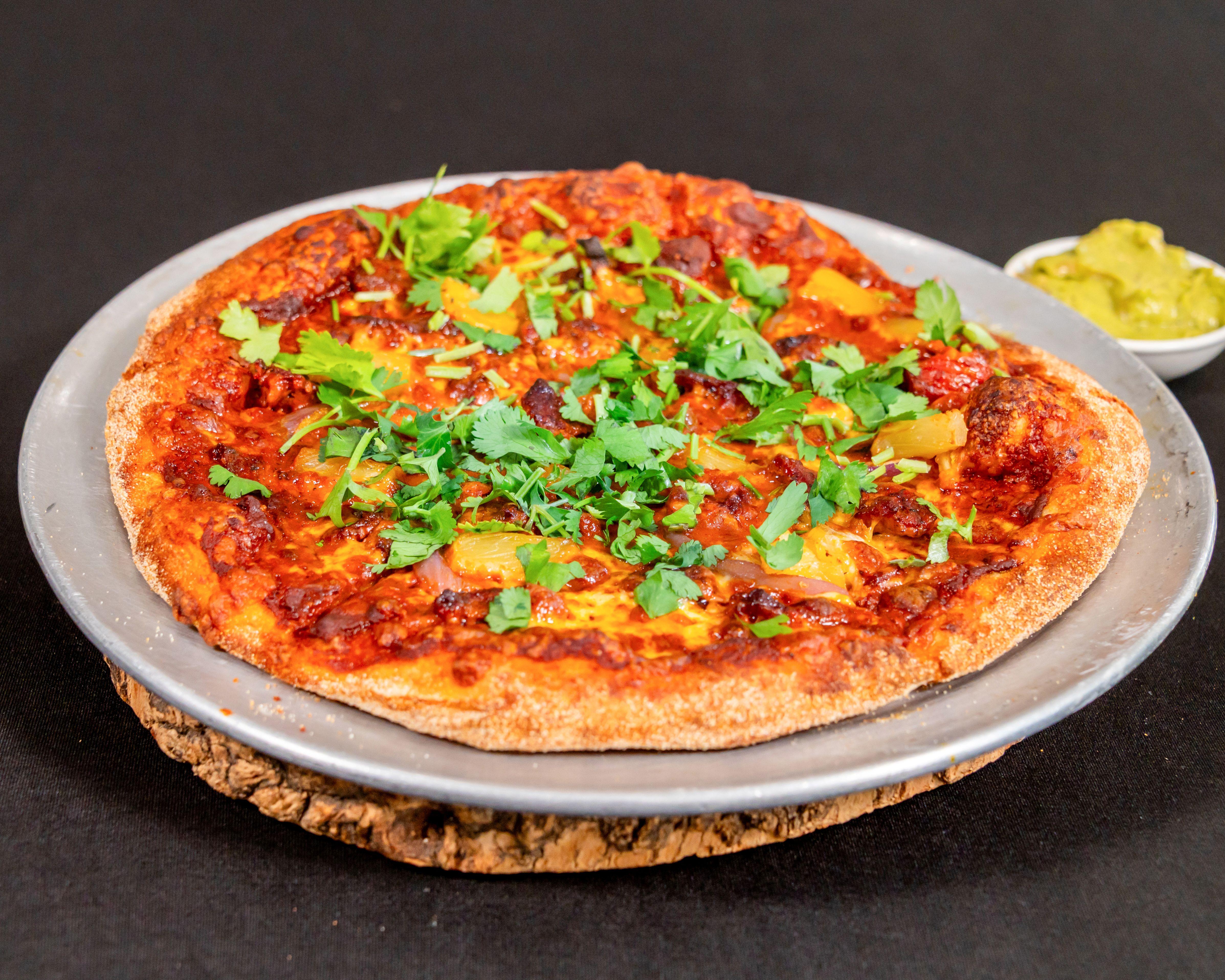 Chorizo, ham, red onions, jalapenos, mozzarella cheese, over refried beans and topped with fresh cilantro after baked.