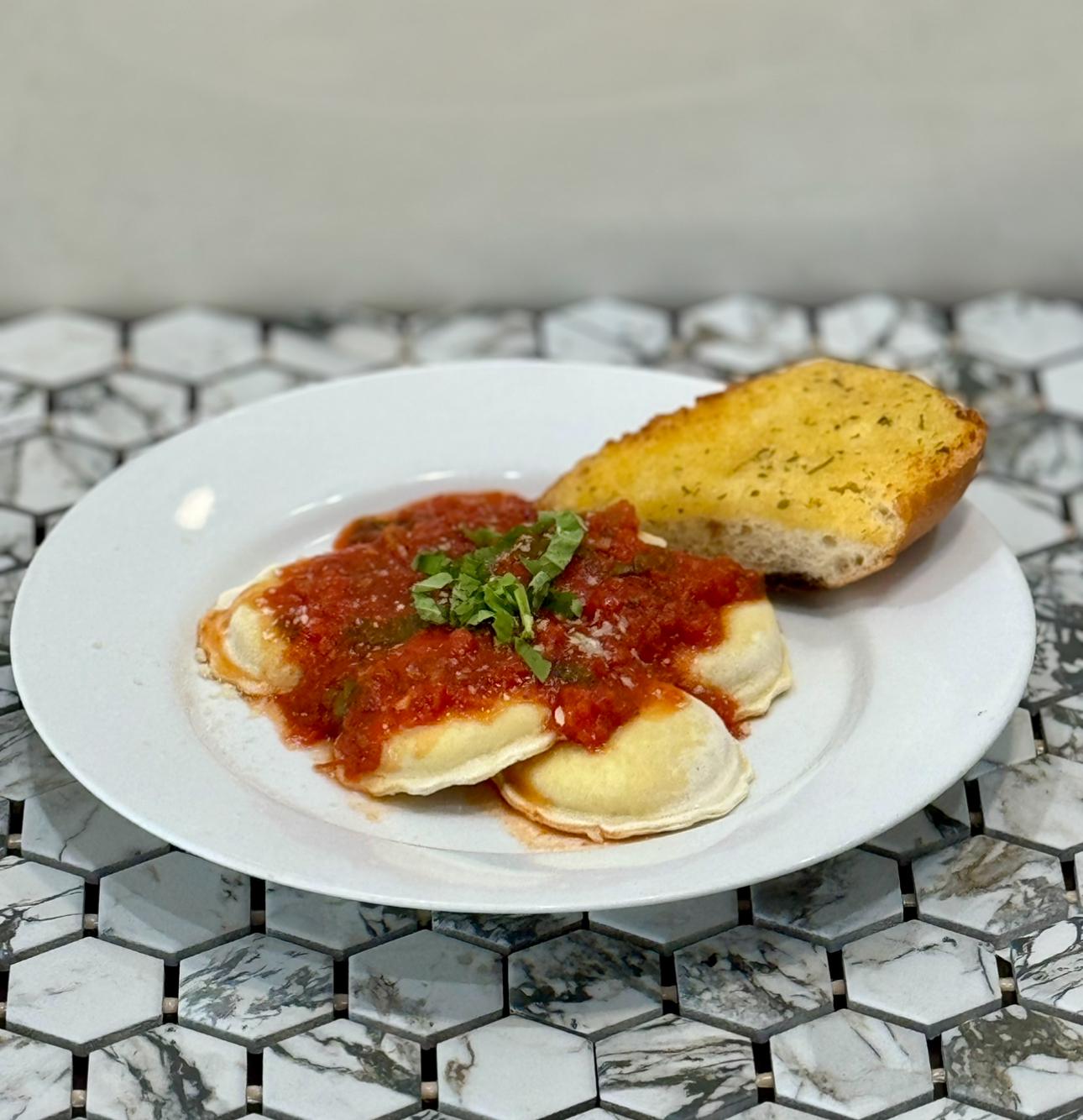 Cheese ravioli with marinara sauce, garnished with parmesan cheese and parsley. Served with garlic bread.