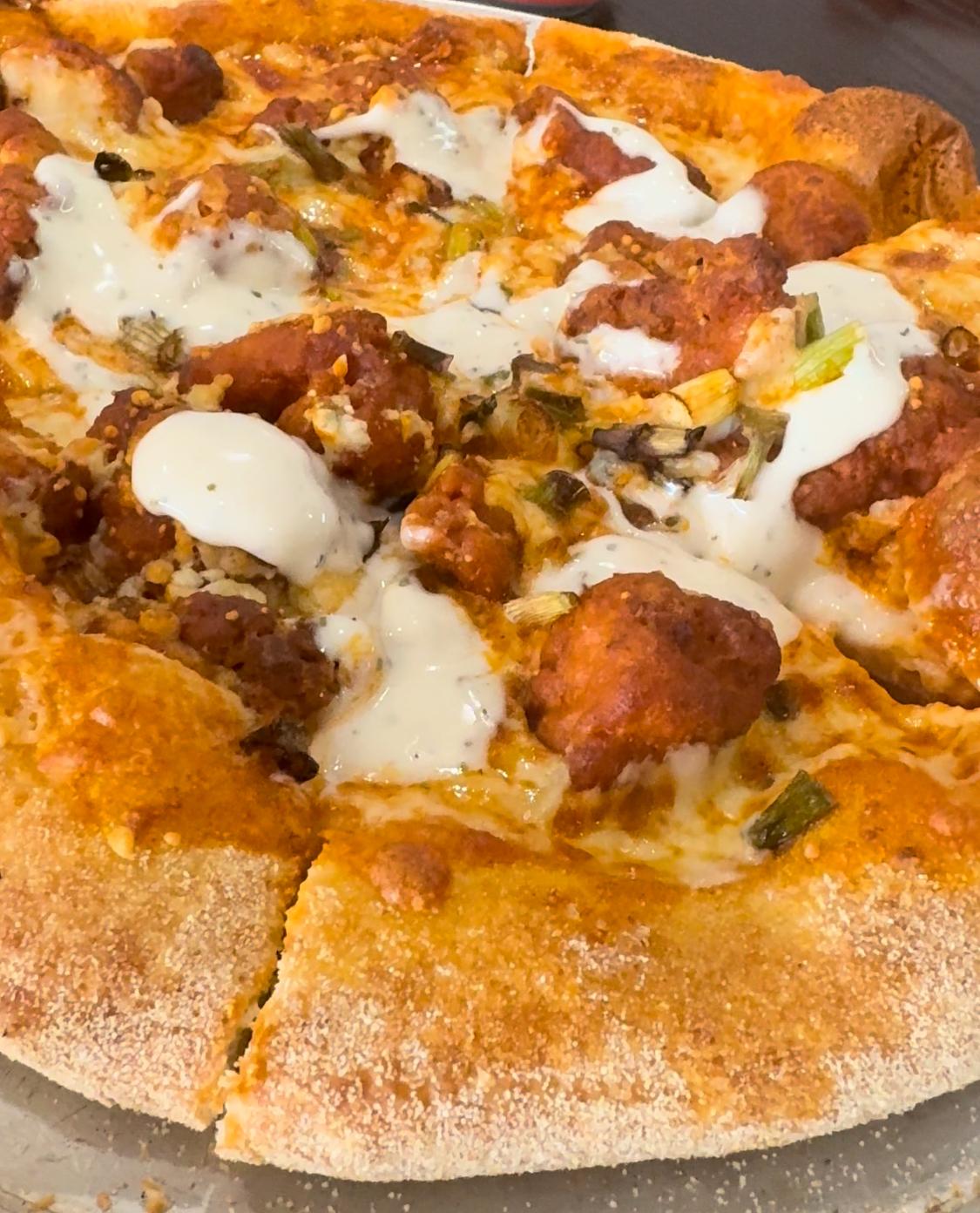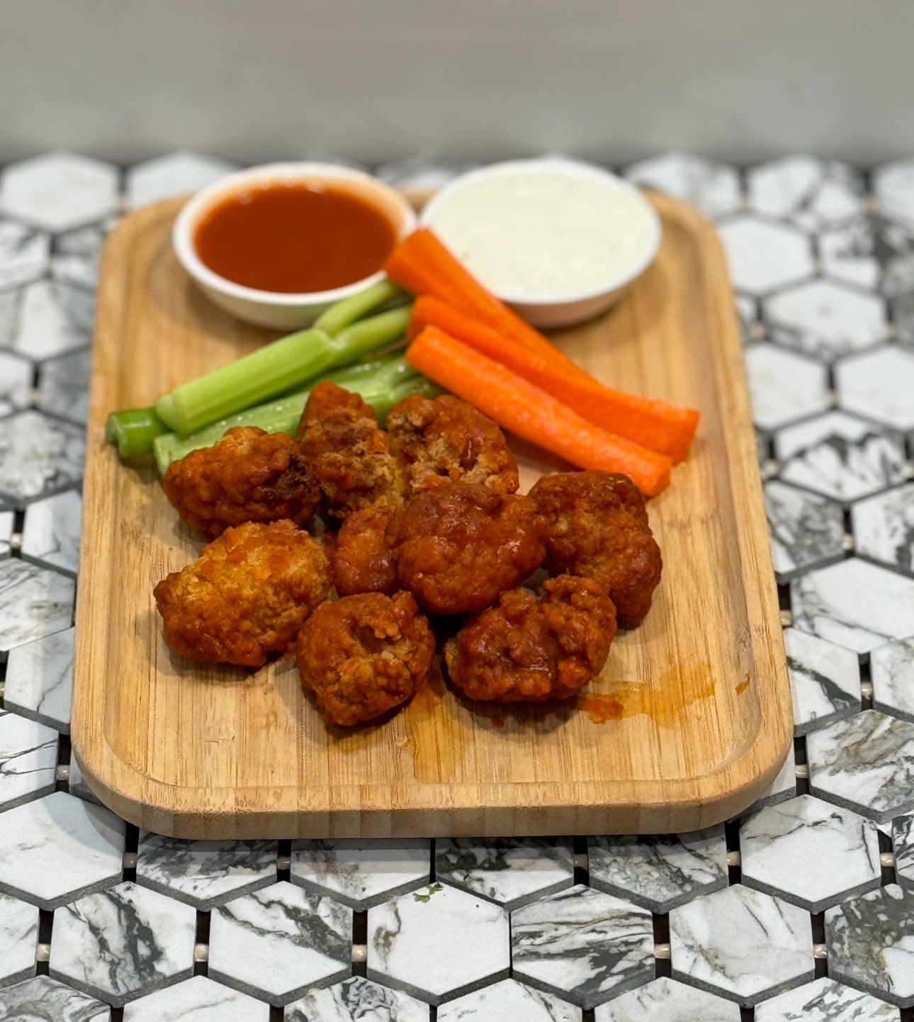 Boneless Chicken Wings tossed in Buffalo Sauce, Green Onions, Blue Cheese Crumbles over Buffalo Sauce and topped with Mozzarella Cheese. Served with a Side of Ranch Dressing.