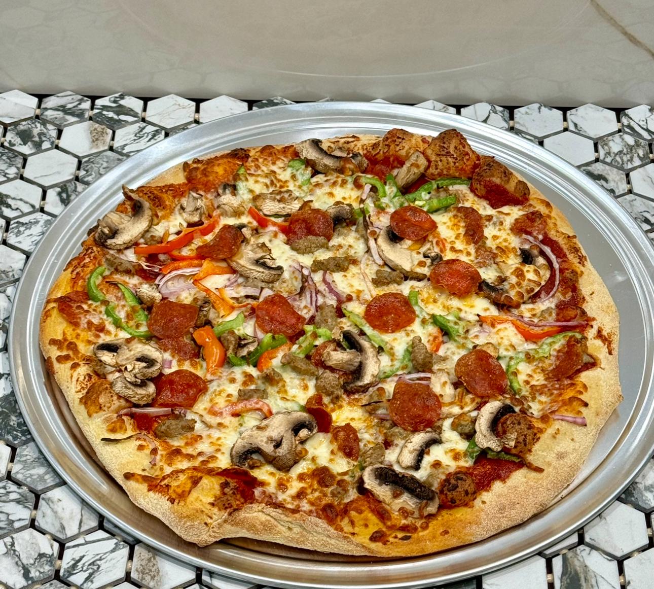 Pepperoni, sausage, mushrooms, bell peppers, black olives, onions & mozzarella cheese on tomato sauce