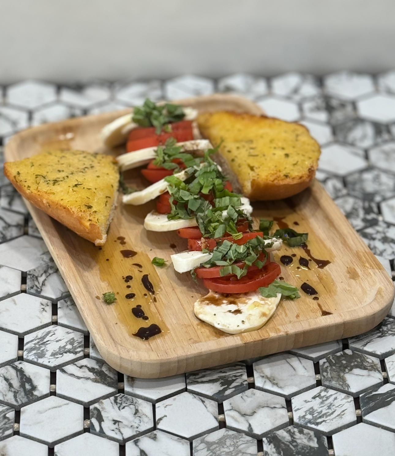Fresh sliced tomatoes, mozzarella, fresh mozzarella, and roasted garlic on herb olive oil, topped with fresh basil after baking