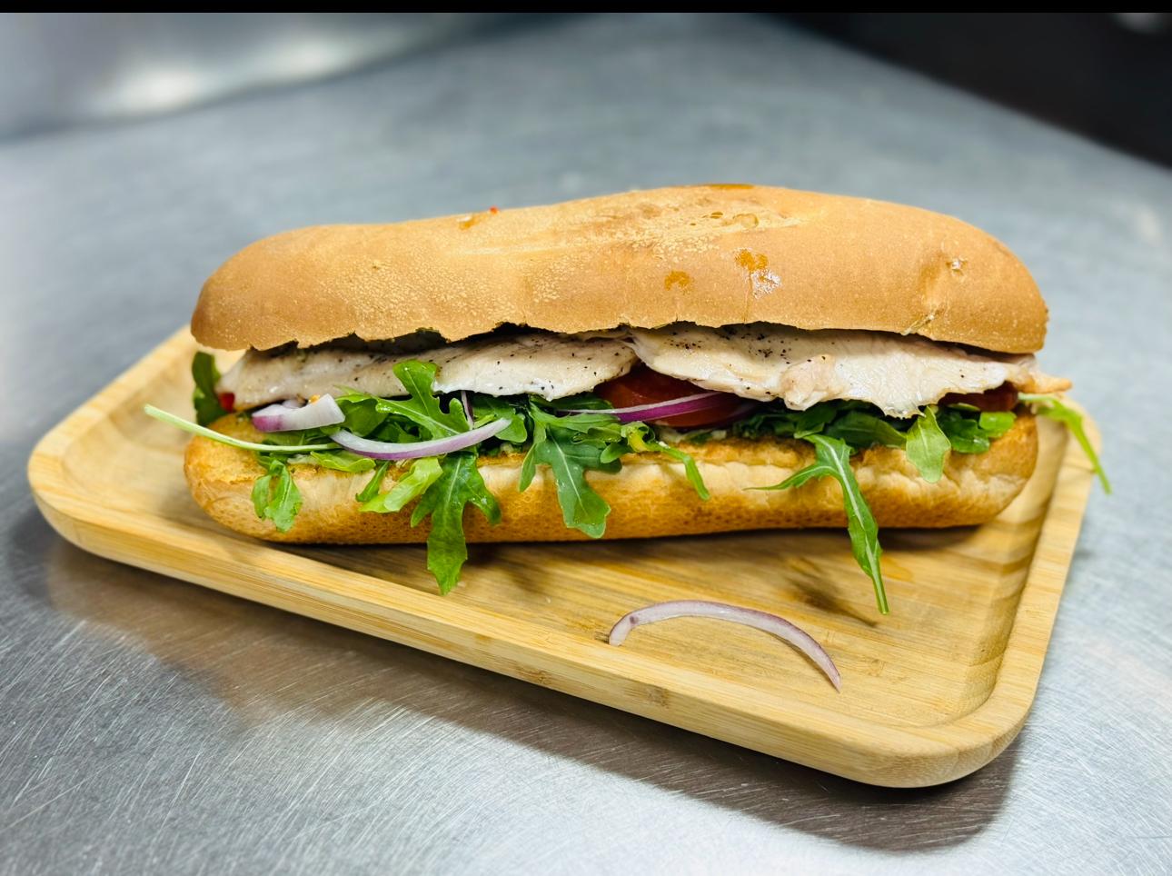 Sautéed chicken breast, tomatoes, red onions, roasted red peppers, spring mix, pesto aioli.