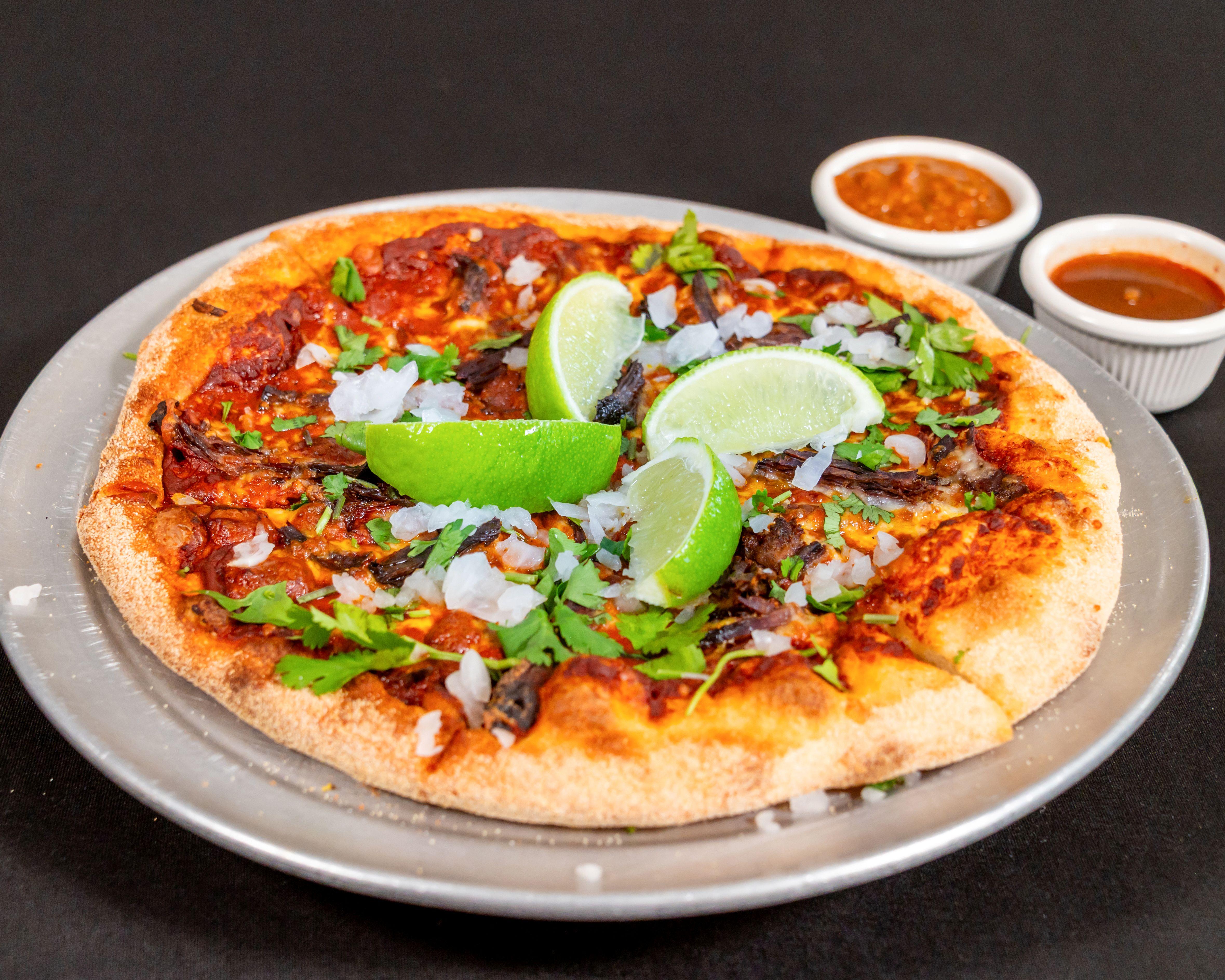 CARNE ASADA, MARINATED ROASTED SHRIMP, RED ONIONS, BELL PEPPERS, CILANTRO ON OUR PICANTE GUACA-TILLO SAUCE.