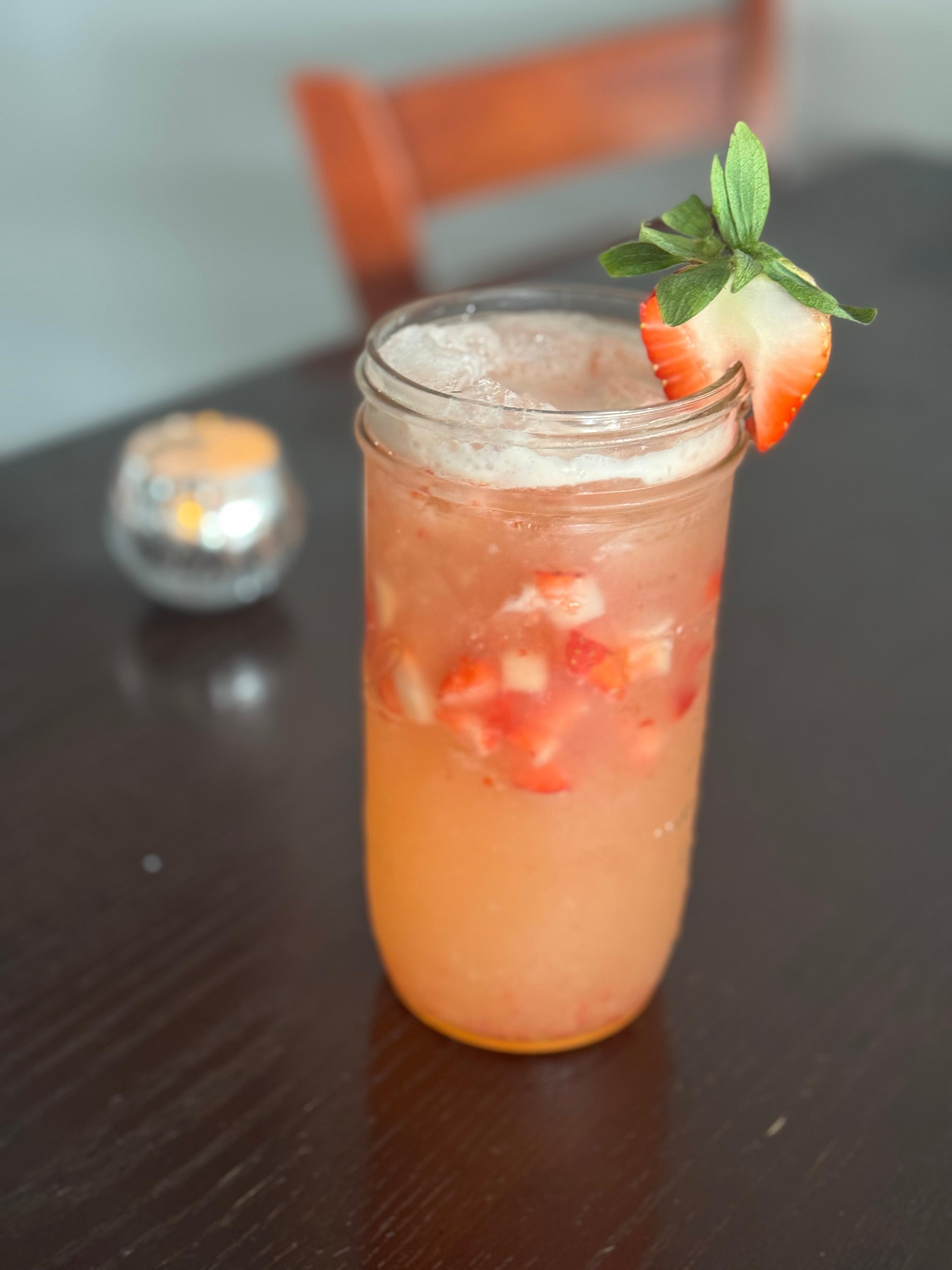 Fresh strawberries smashed and mixed with hand made lemonade. Sweetened with brown sugar and garnished with fresh fruit.