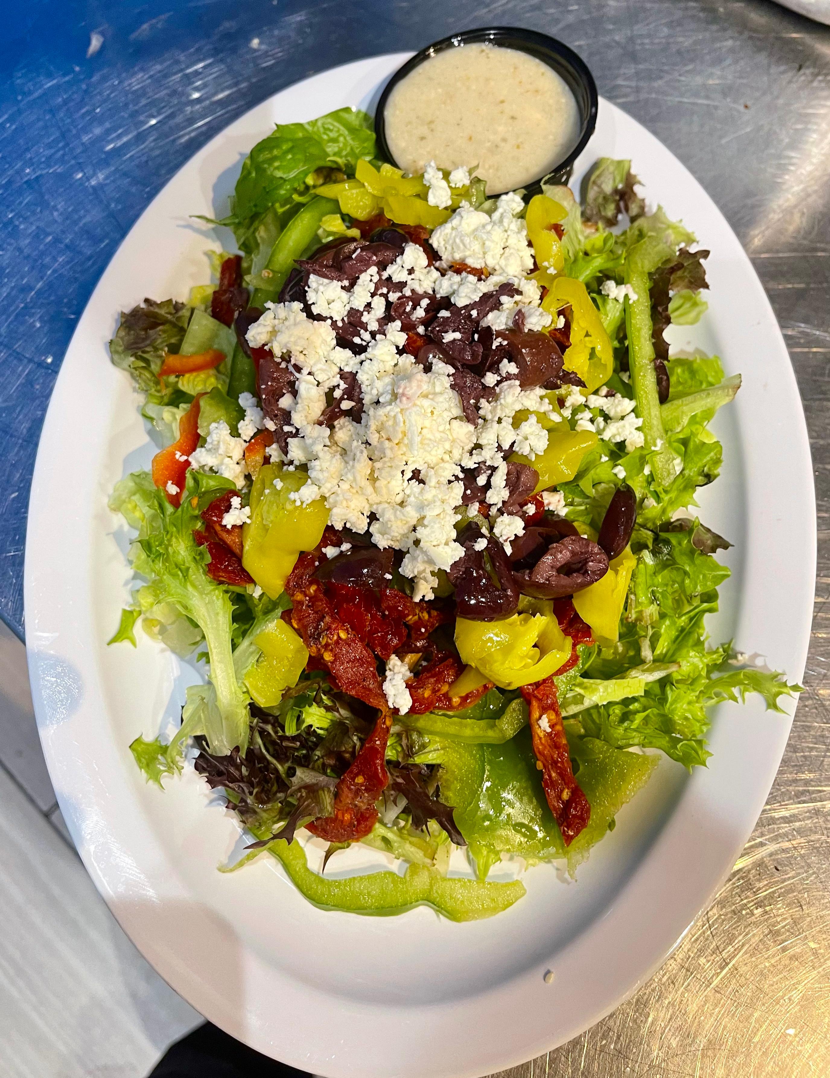 Mixed greens with sweet bell peppers, Greek olives, feta cheese, pepperoncini, and sun-dried tomatoes.