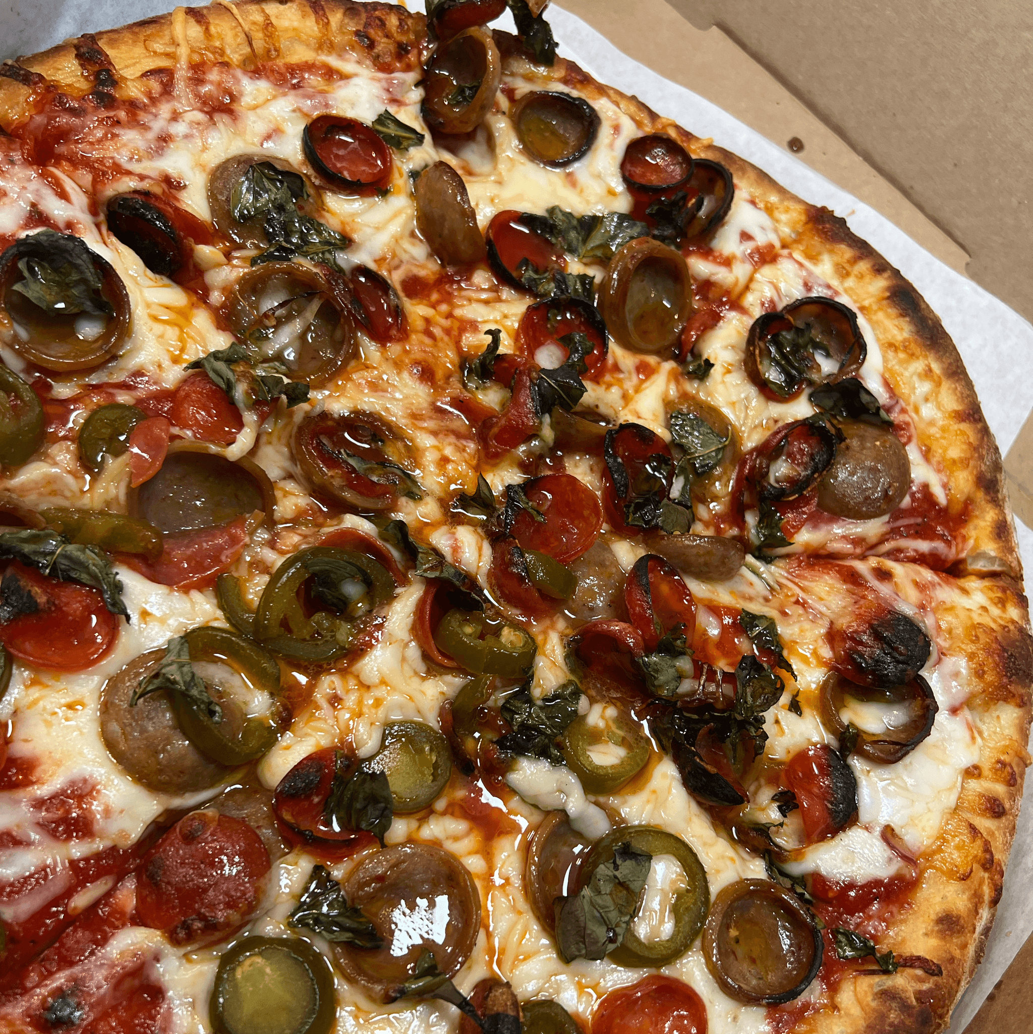 A nice savory delicious pie with pepperoni Italian sausage basil with half jalapeños topped with Mike’s fiery fire honey drip . All your taste buds will happy !