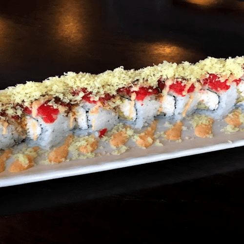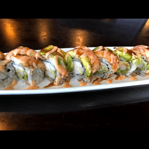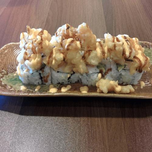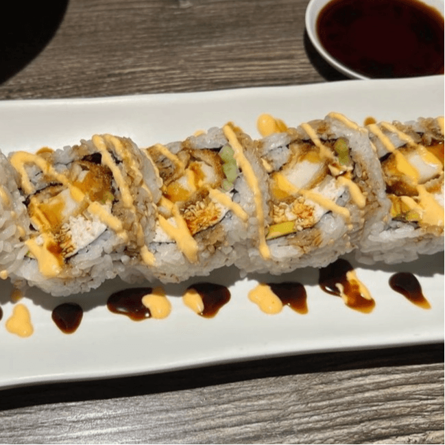 Shrimp tempura, imitation crab, avocado and cucumber roll topped with crunch, eel sauce and spicy mayo.