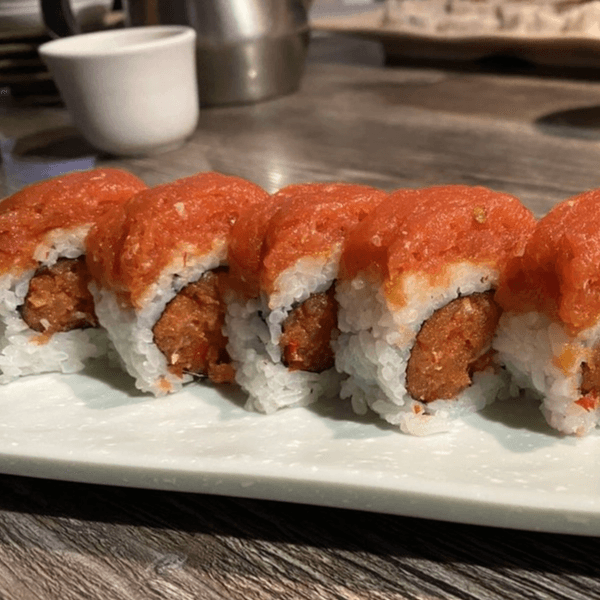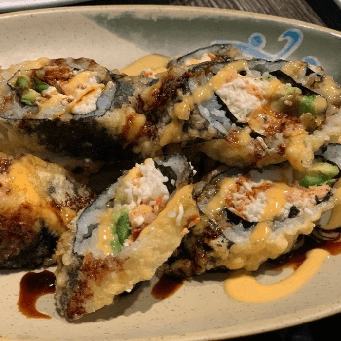 Spicy tuna, imitation crab, cream cheese, jalapeño, & avocado roll, then deep-fried and topped w/ spicy mayo and eel sauce