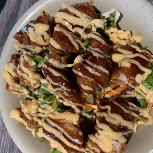 Calamari katsu, imitation crab, avocado and cucumber roll topped with eel sauce and spicy mayo.
