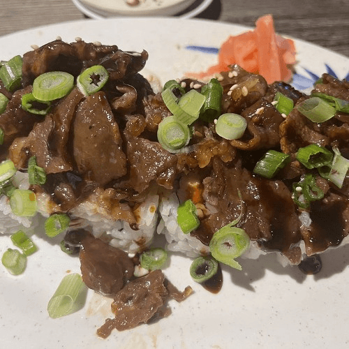 Thin ribeye beef marinated with a sweet Korean sauce and topped with green onions. Served with rice and a small salad.