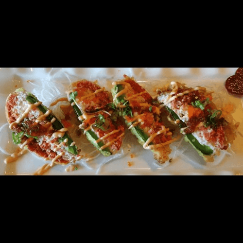Jalapeños stuffed w/ cream cheese, imitation crab, & spicy tuna, then deep-fried & topped w/ eel sauce & spicy mayo