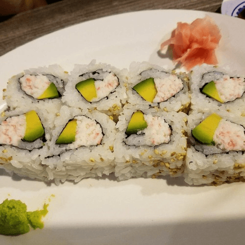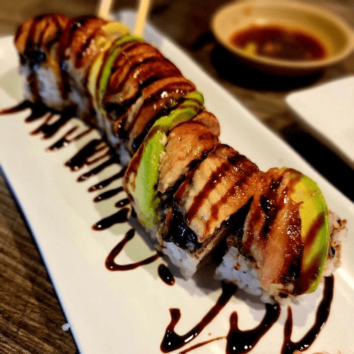 Eel, imitation crab and avocado roll topped with avocado and eel sauce.