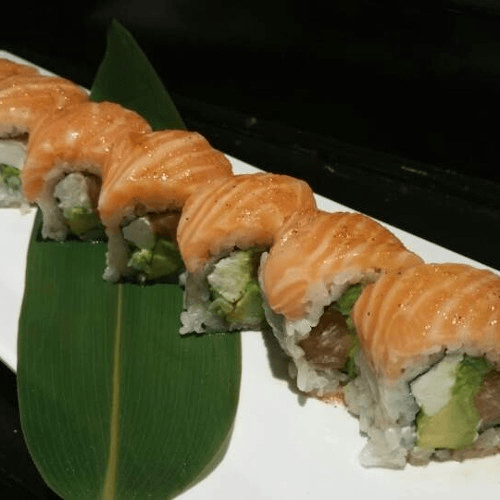 Shrimp tempura, imitation crab, & avocado roll topped w/ salmon, eel sauce, & dynamite sauce, then baked.