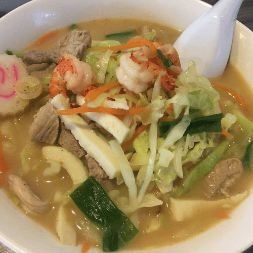Chicken, fishcake, shiitake mushrooms, egg drop and green onions.
