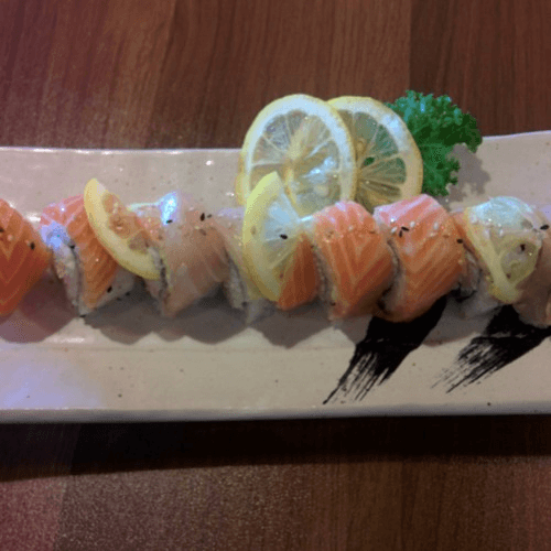 Shrimp tempura and imitation crab roll topped with salmon, sliced lemon, eel sauce and spicy mayo.