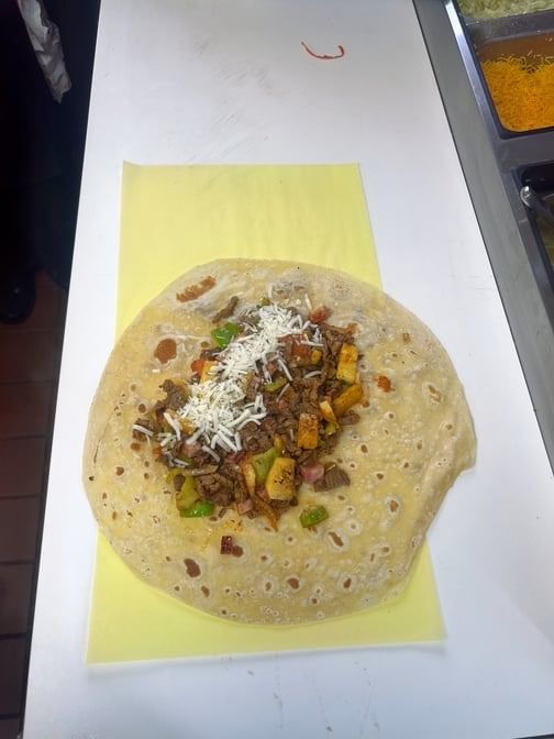 Quesadilla - then wrapped with carne asada, fries, guacamole, sour cream - like a burrito