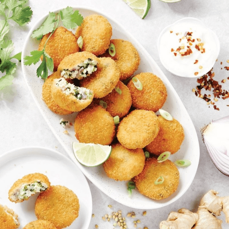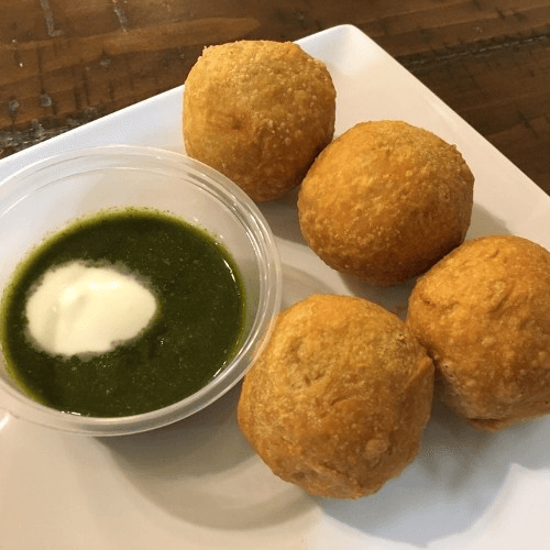 4 PCs ofmashed potato patty coated with chickpea flour, which is then deep-fried and served with tamarind and cilantro chutneys.