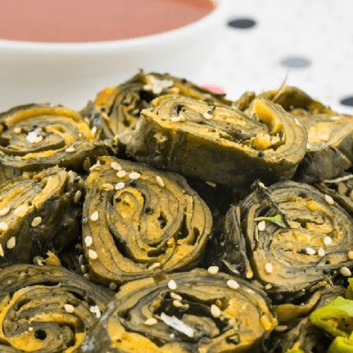 Patra is a traditional Indian snack made from rolled colocasia leaves stuffed with a spiced gram flour mixture and steamed or fried. It's known for its flavorful, tangy, and aromatic taste.
