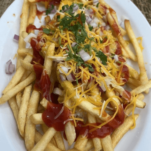 French fries, tikka sauce, ketchup. Onions, in house garlic sauce