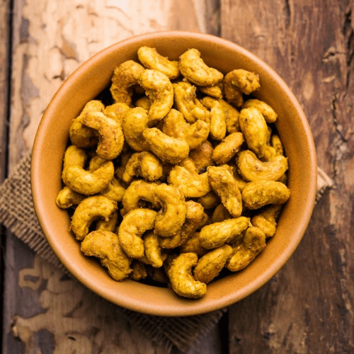 A spicy mixture of fried rice puffs, cashews, masala peanuts, masala cashews, maag, tikhi sev and masala peas.
