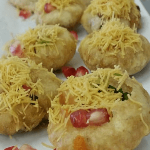 7 puris stuffed with potatoes, onions, chickpeas, tamarind, and green chutney. Topped with Sev and cilantro with a hint of spicy garlic chutney