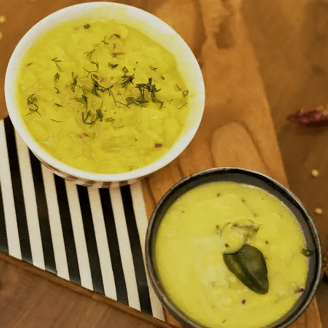 8oz of Khitchdi (Special Rice mixed with lentils) and 8oz of Kadhi (Yogurt based soup mixed with gram flour)