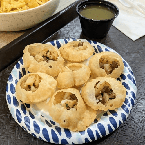 7 round, hollow puri, fried crisp, and filled with a mixture of flavored water