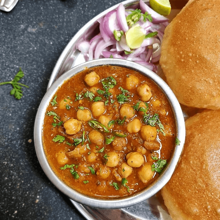 Garbanzo beans curry served with 5 pieces of puffed whole wheat bread.