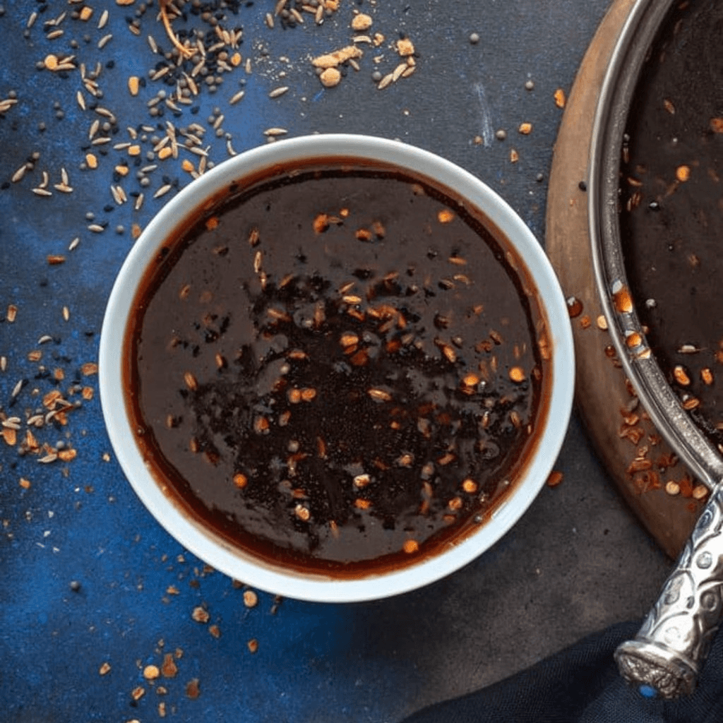 Fried lentil balls soaked with sweet yoghurt, topped with tamarind chutney and spices