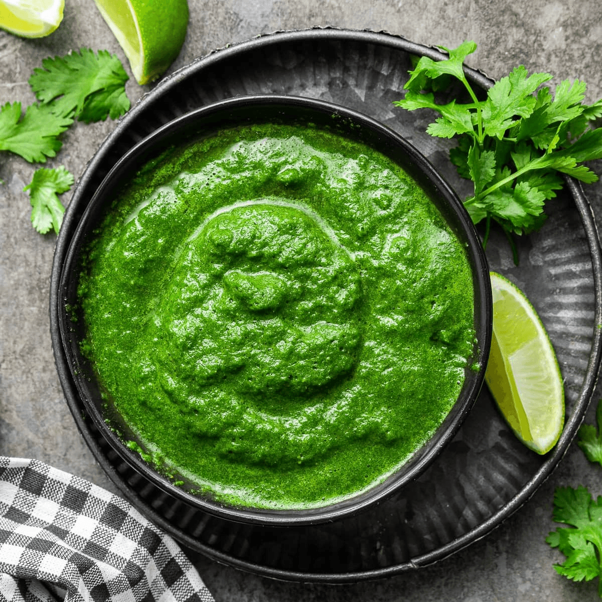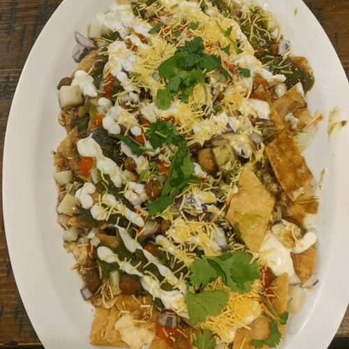 Fried tortilla chips with sweet, savory chutneys, onions, sev, cilantro, and sweet yogurt