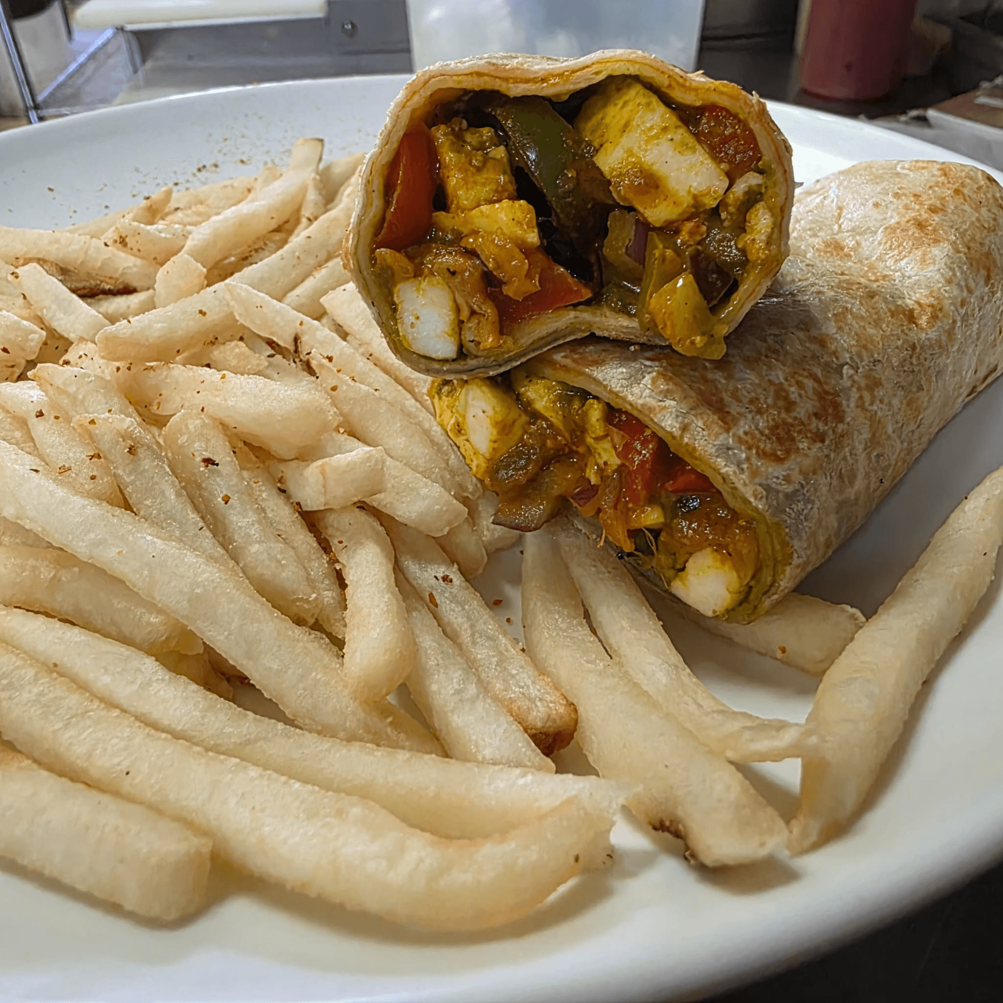 2 Pcs of Paneer Kathi Roll and Fries on the side.